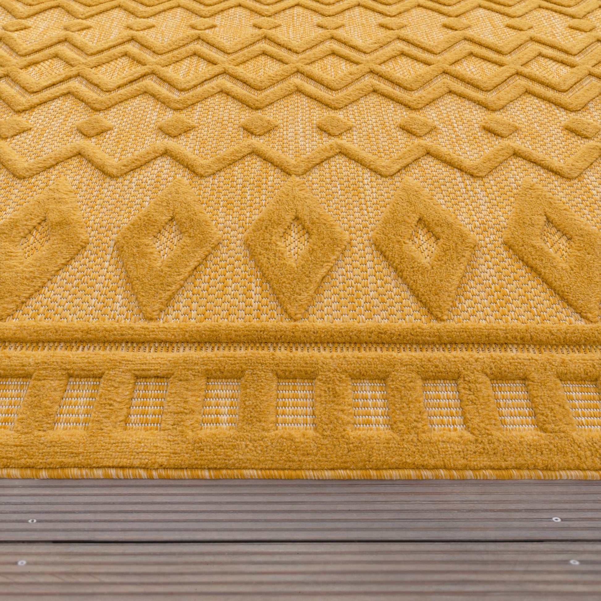 This area rug creates a vibrant yet sophisticated canvas for you and your guests to enjoy. Its lively yellow color can brighten up any floor, and its geometric shapes fit in to any decorating scheme. This rug develops the perfect centerpiece for a relaxing atmosphere with suggestive tones of modern design. The multi-textured rug features a combination of high and low patterning that's designed to add extra panache and visual interest to any indoor or outdoor living space. Its durable construction means that it will stand up well to daily traffic without becoming faded or worn to ensure that it will look great for many years to come. The materials used to produce this decorative rug have been tested and certified to be free of harmful substances in accordance with OEKO-TEX Standard 100, so you'll be able to use it with confidence and peace of mind in any room of your home.