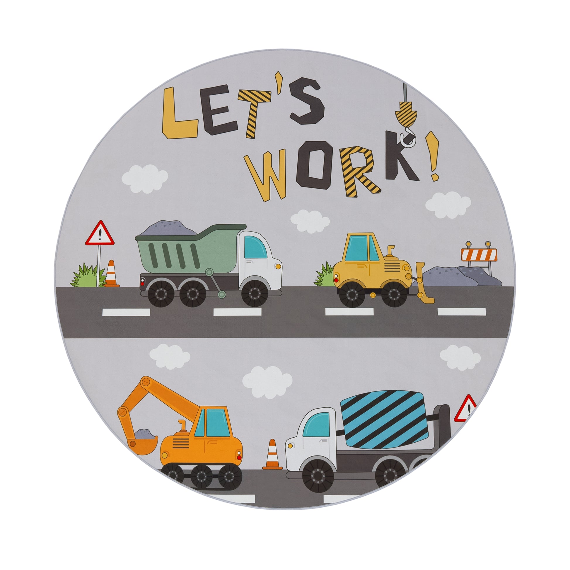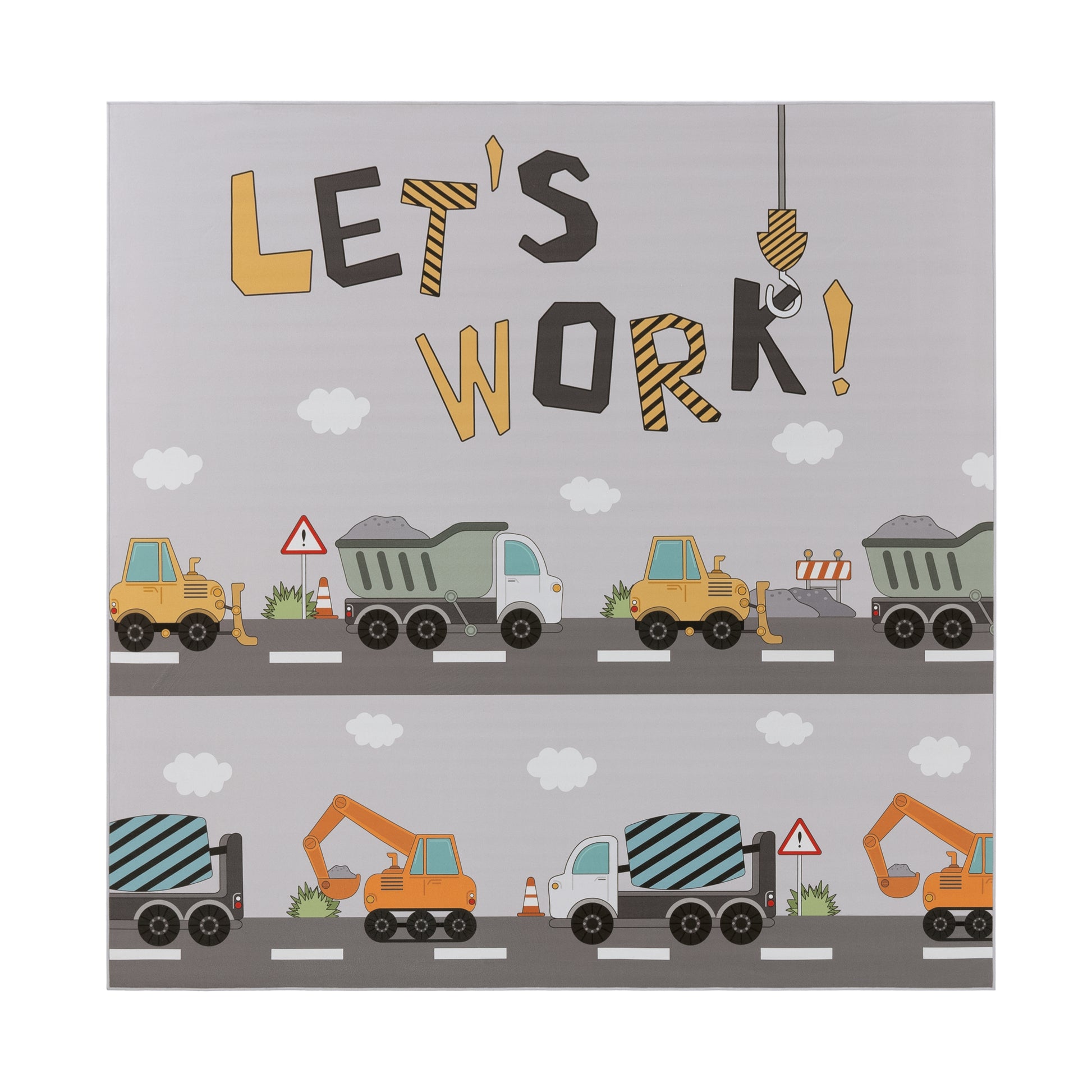Rugs for born craftsmen and engineers With these rugs, you can turn your children’s room into a building site wonderland. Here, your children can let off steam, play and develop. Your little inventors will have a lot of fun meeting the many challenges a building site can set. The delicate greyish background gives the rugs the street surface and the pale sky above. Colorful elements are created by a great variety of building site vehicles and with small details such as grassy green bushes, fences, and road signs. Striking lettering in black and yellow is a masterful touch that rounds off the working atmosphere with the words “Let’s work”. So, that nothing can interrupt playtime fun, these rugs are made to be particularly robust. The synthetic fibers ensure durability and is also easy to clean. Parents shouldn’t have to waste the free time that they have with hours of cleaning and scrubbing of everyday items, which means that you have made the right choice with this home accessory. In addition, the STANDARD 100 by OEKO-TEX seal of approval also guarantees carefree playtime.