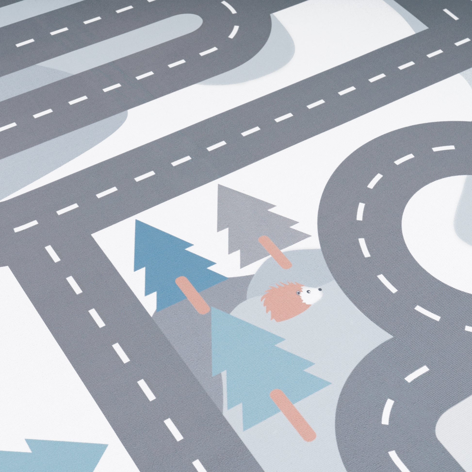 Peaceful and playful, this cute children's rug takes your little ones on a trip through dreamlike snow-covered mountains and enchanting forests. Hedgehogs, rabbits, foxes and a sweet bear are all waiting to play along on the exciting road, while two idyllic teepees create a haven of security. Whether it's for adventurous girls or curious boys – this beautiful play rug with its soft grey and cream shades brings harmonious play and fun to the children's room!